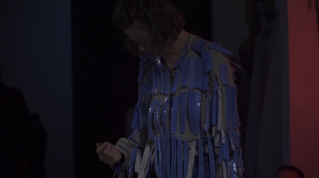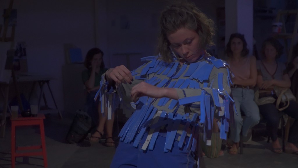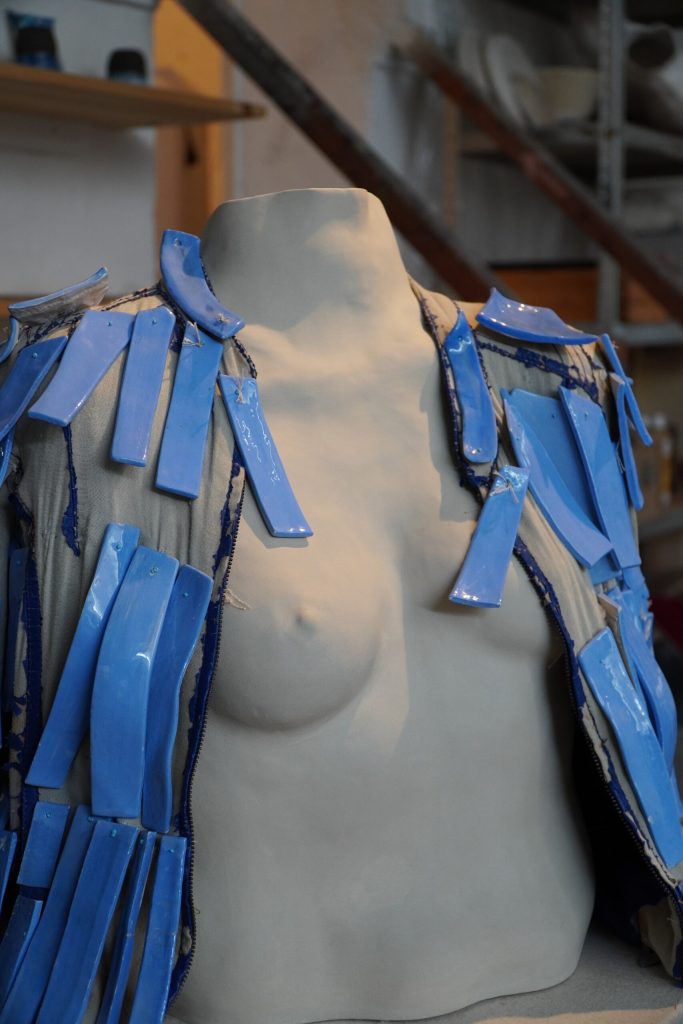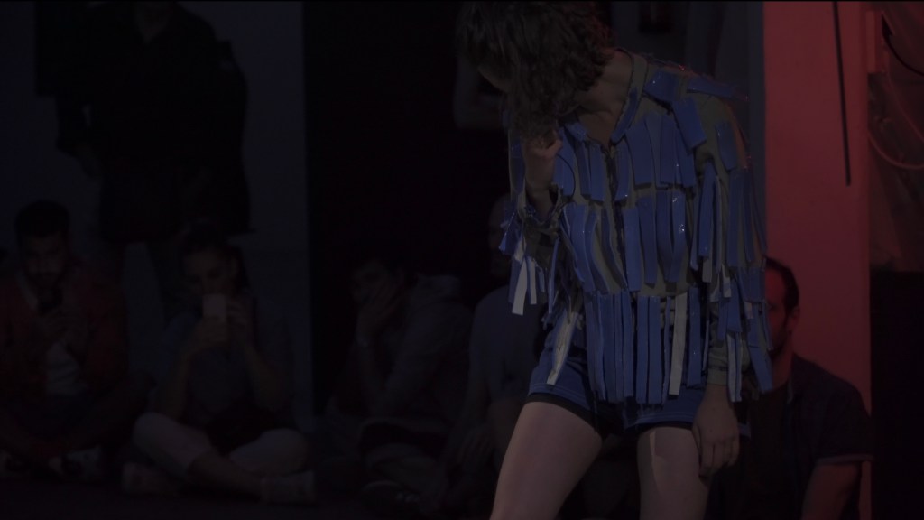 Relations create individuals. In Blue Sound, the artist dresses a dancer with a costume made of blue ceramic feathers. It’s blue, heavy, and noisy. The model is in the middle of the room, standing in front of the creator that now faces them, observes them and amplifies their sounds. Breathing, clapping of the little pieces of ceramic, everything becomes bigger and louder. By exploring the relationships in which they are taken, the vulnerable dancer falls into a deviation, loses their model condition, changes side, becomes something strong, violent, aggressive. A bird is at war. Little by little, the jacket loses its pieces, the armor gets lighter.