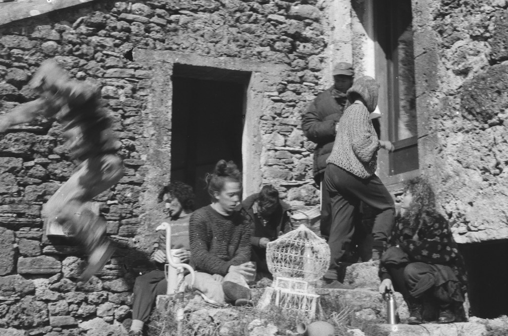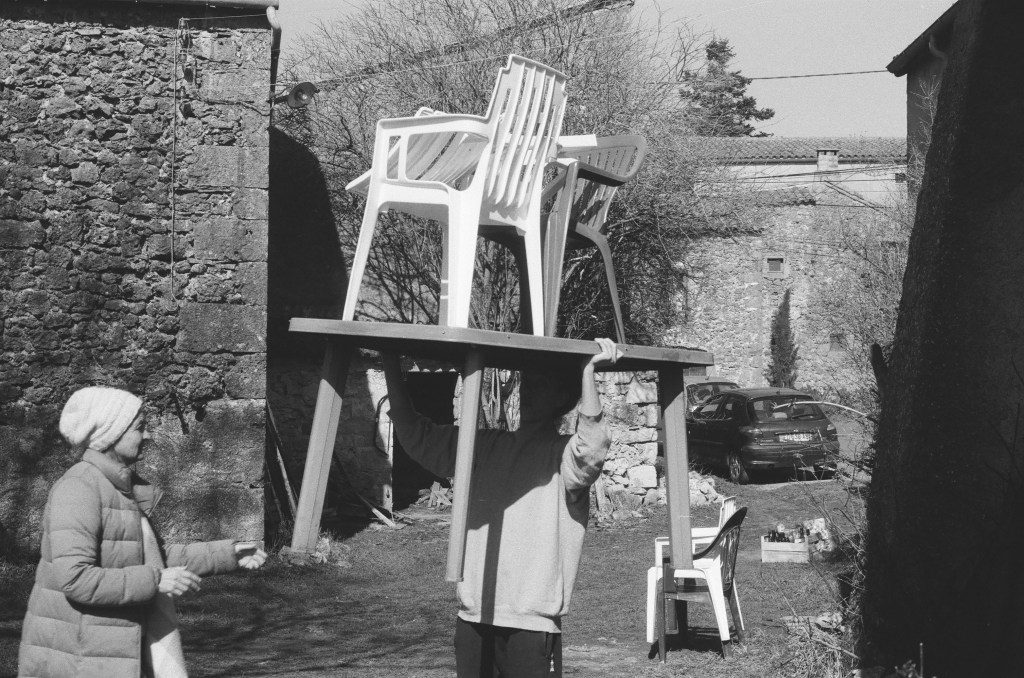 Working the role as «a stabilisation, densification, punctual thickening of certain relationships» (Léa Rivière). Being in a village is a way of getting to grips with the politics of the places we live in together, of observing how we replace individual, identities with relationships and communities. Having the opportunity to put on several costumes, to wear several hats, to wear names and pronouns, to wear make-up to hide and reveal other parts of what moves us. Borrowing dances and faces. Putting ourselves collectively at the service of transitions, transformations, displacements and moves. Finding out where we are hungry. Allowing ourselves very long periods of encounter, going with the river, the cats, the birds, the ants, the blades of grass, the floorboards, composting, peeling vegetables slowly, crying all over our onions, dancing the night away, watching over it, building a fire, falling into holes and cracks, licking the geology, giving ourselves seasonal prunings, sedimenting, negotiating life and death, their forms, feeling-with, conspiring, tuning, trembling, wavering, shaking, diverging in relation, being different with, practising solitude collectively, envisaging, mourning and assisting births. And meeting together, regularly, in a place, Church or Town Hall, solemnly, rigorously, unfolding our stories and points of view, bearing witness, sharing our perspectives, giving each other feedback, explaining our experiences, theorising about them, poeticising them, opening our toolbox to the eyes of others, dipping into it and using words, writing, leaving traces. Finding out what we know. And also making decisions, becoming a family with consensus and dissensus, practicing trust and building it.
