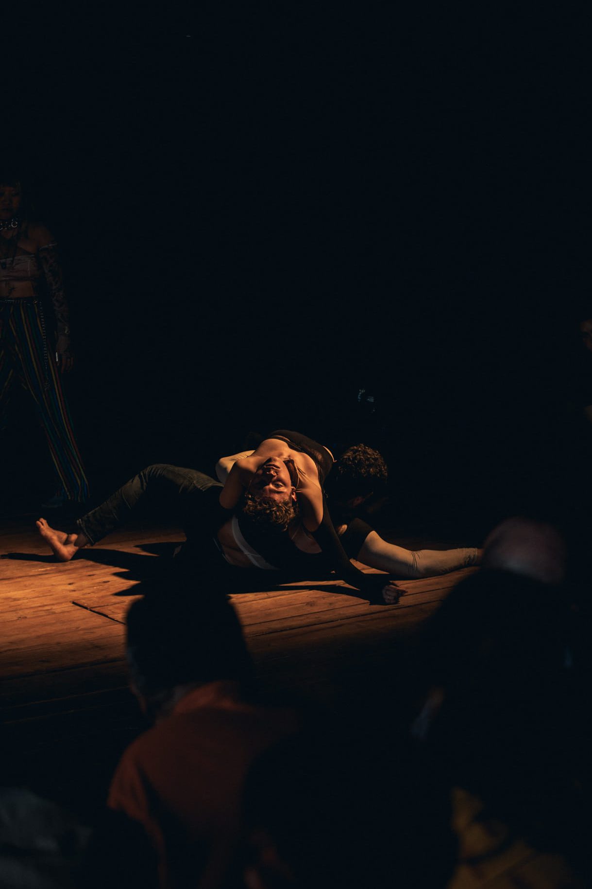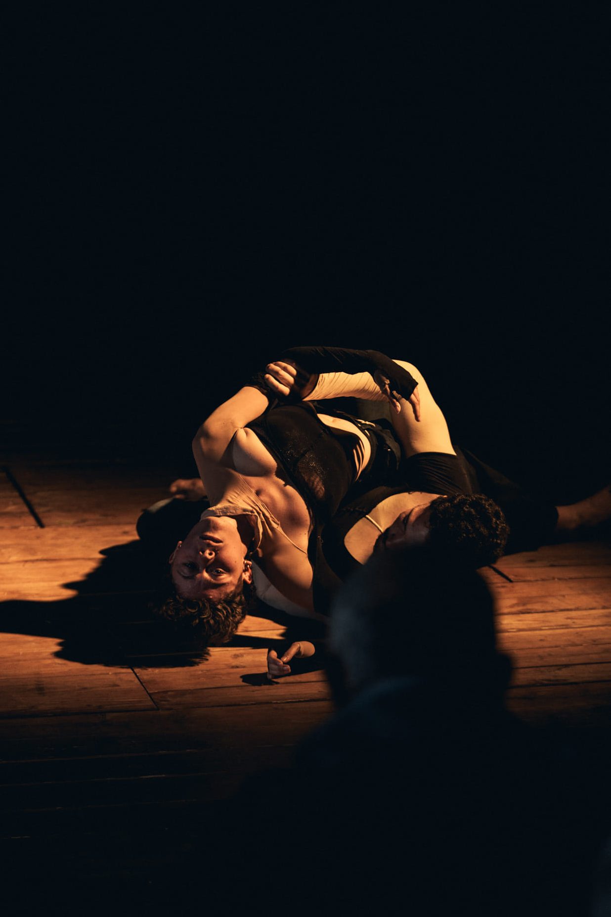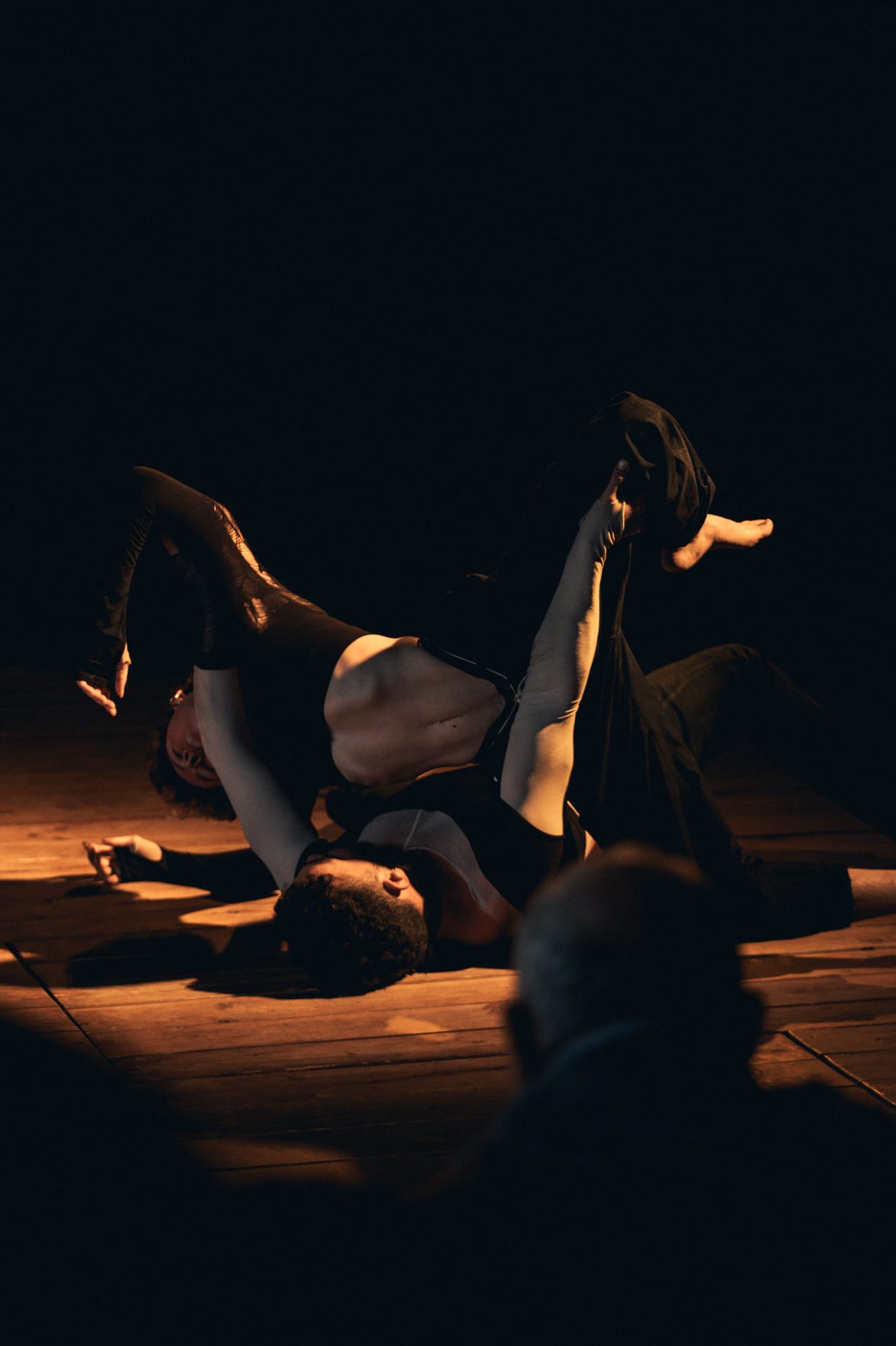 From Olivia Tapiero’s Un carré de poussière came the desire to inquire into the perspective of the world from the point of view of dust, rubbish, waste, trash, garbage and accumulation. We studied the decomposition of our own body-matter. Discharging, flattening out, abandoning shape. How to give your trust entirely to someone else? How to offload responsibility? How to accept being manipulated? What does handling entail? We became both garbage pile and the humans taking care of it, walking on it, compacting it, packaging it, transporting it. Our piece is about the ground we walk on, which we can see as a heap of our heritage, the humus of our ancestors, the soil of our ghosts. Our piece is about weight, about the gravity that insists on our movements and reminds us of the ground, reminds us of a certain humility. Our piece asks us about dress, usage and the appropriate response. Our piece teaches us a relaxed seriousness, a soft and viscous elegance, the serious and the sensitive, rigour without rigidity. Our piece asks us to make nests out of twigs, to build shelters out of debris, to arrange the pieces with patience and delicacy. Our piece asks us to take the time to let ourselves be affected by the other, to let ourselves be moved, violently and tenderly.