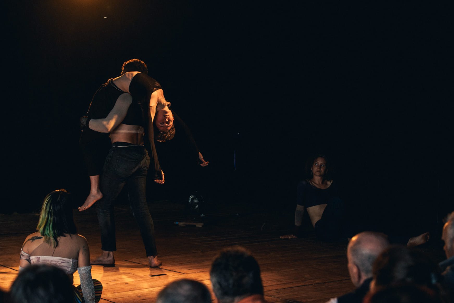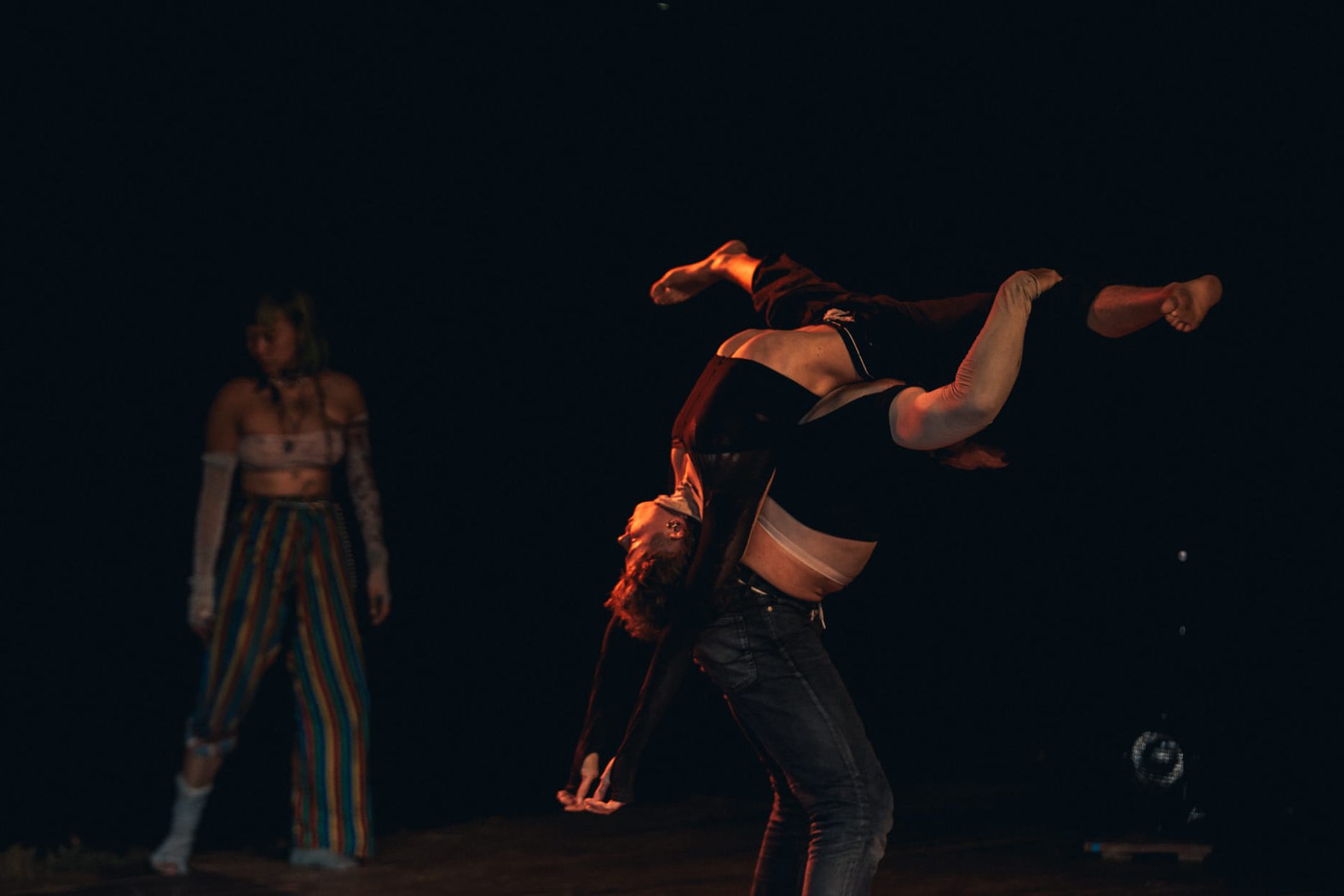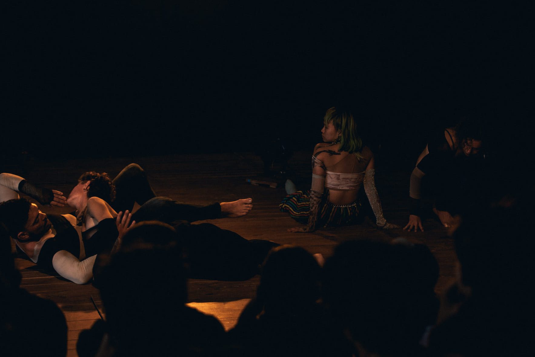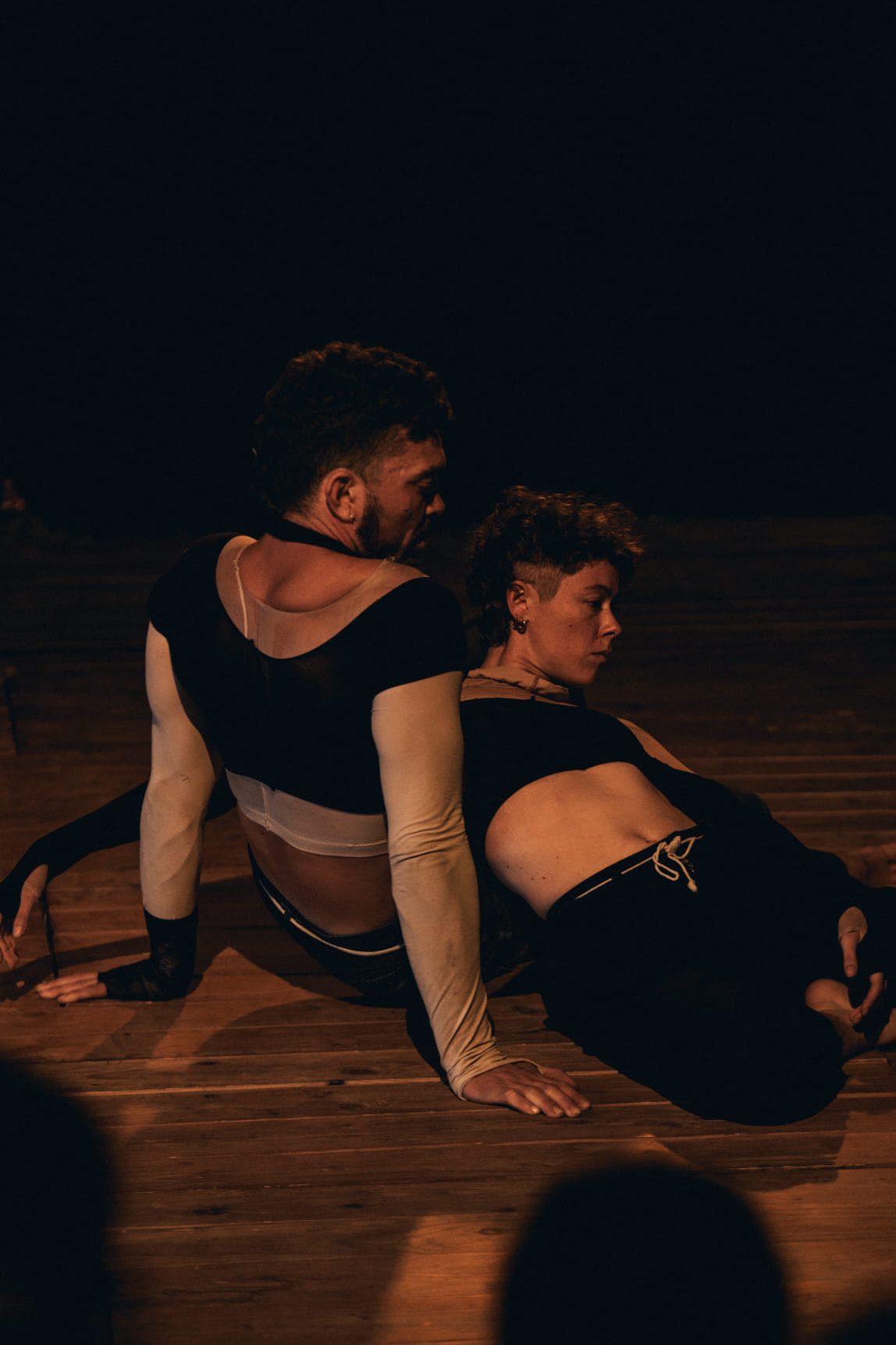 From Olivia Tapiero’s Un carré de poussière came the desire to inquire into the perspective of the world from the point of view of dust, rubbish, waste, trash, garbage and accumulation. We studied the decomposition of our own body-matter. Discharging, flattening out, abandoning shape. How to give your trust entirely to someone else? How to offload responsibility? How to accept being manipulated? What does handling entail? We became both garbage pile and the humans taking care of it, walking on it, compacting it, packaging it, transporting it. Our piece is about the ground we walk on, which we can see as a heap of our heritage, the humus of our ancestors, the soil of our ghosts. Our piece is about weight, about the gravity that insists on our movements and reminds us of the ground, reminds us of a certain humility. Our piece asks us about dress, usage and the appropriate response. Our piece teaches us a relaxed seriousness, a soft and viscous elegance, the serious and the sensitive, rigour without rigidity. Our piece asks us to make nests out of twigs, to build shelters out of debris, to arrange the pieces with patience and delicacy. Our piece asks us to take the time to let ourselves be affected by the other, to let ourselves be moved, violently and tenderly.