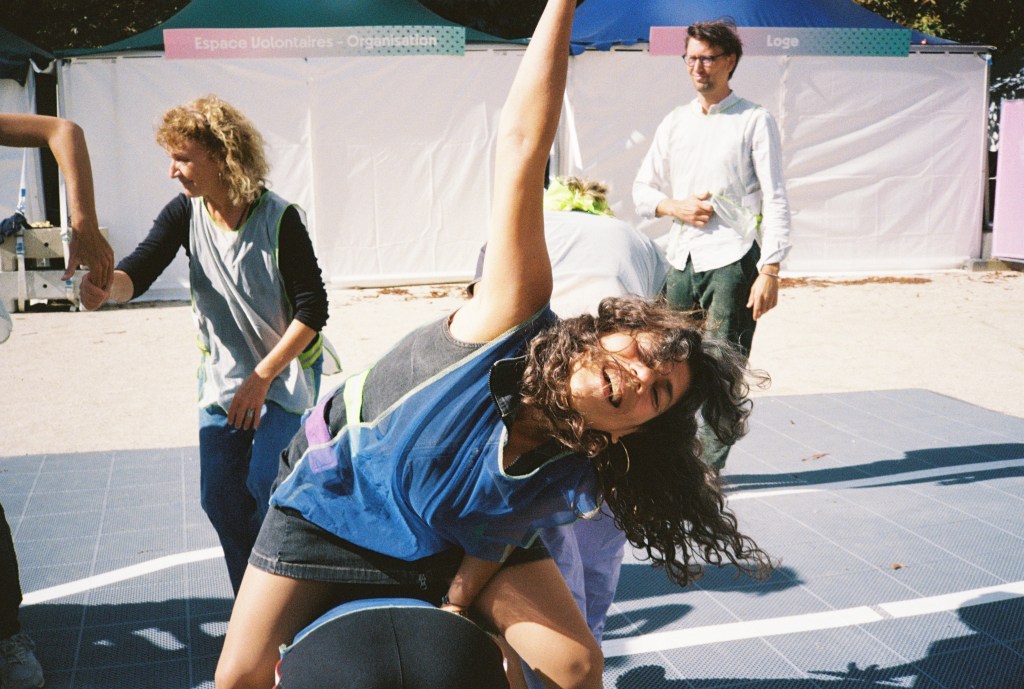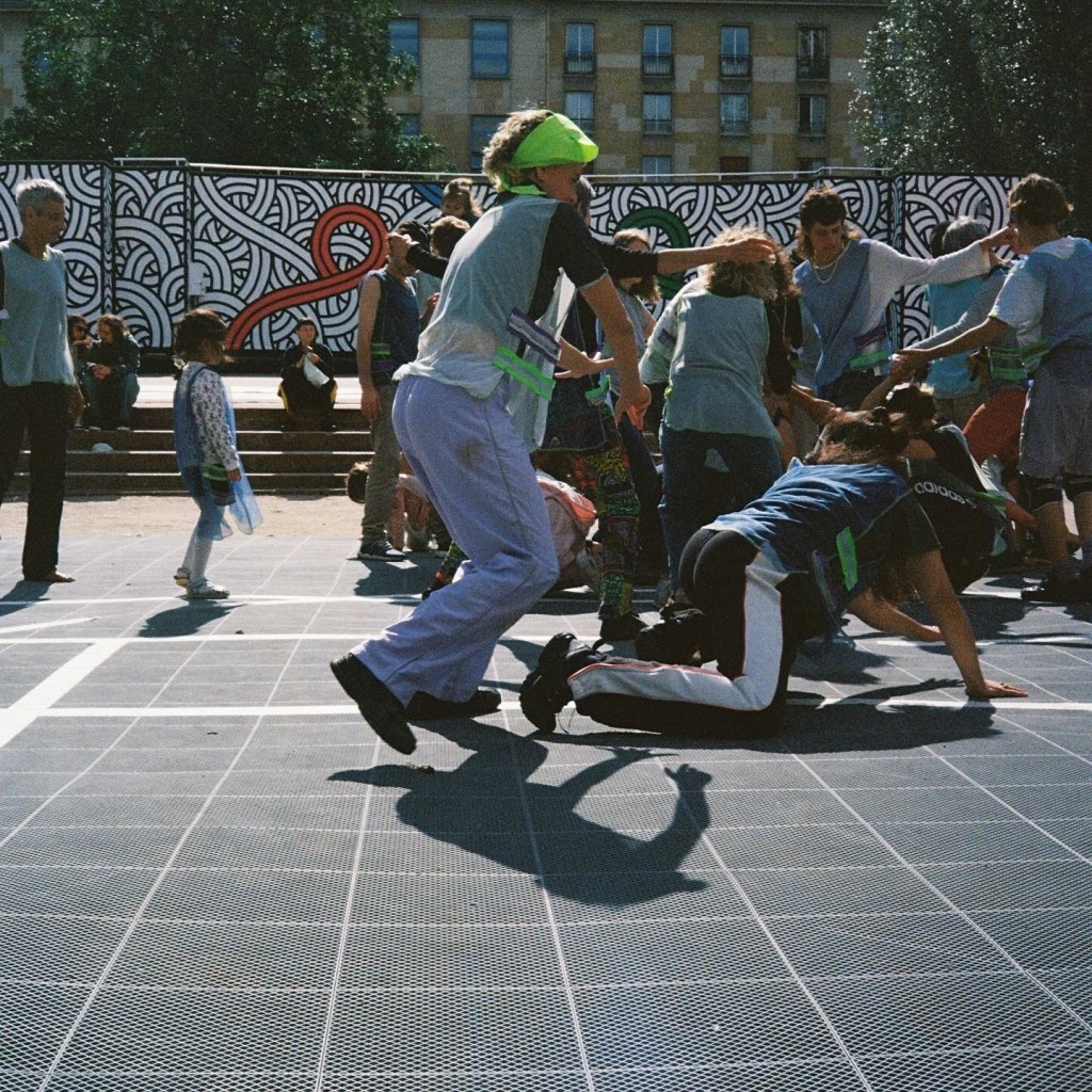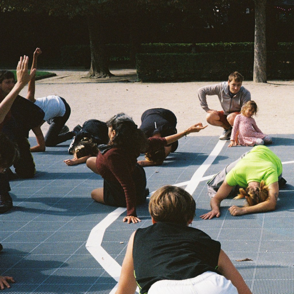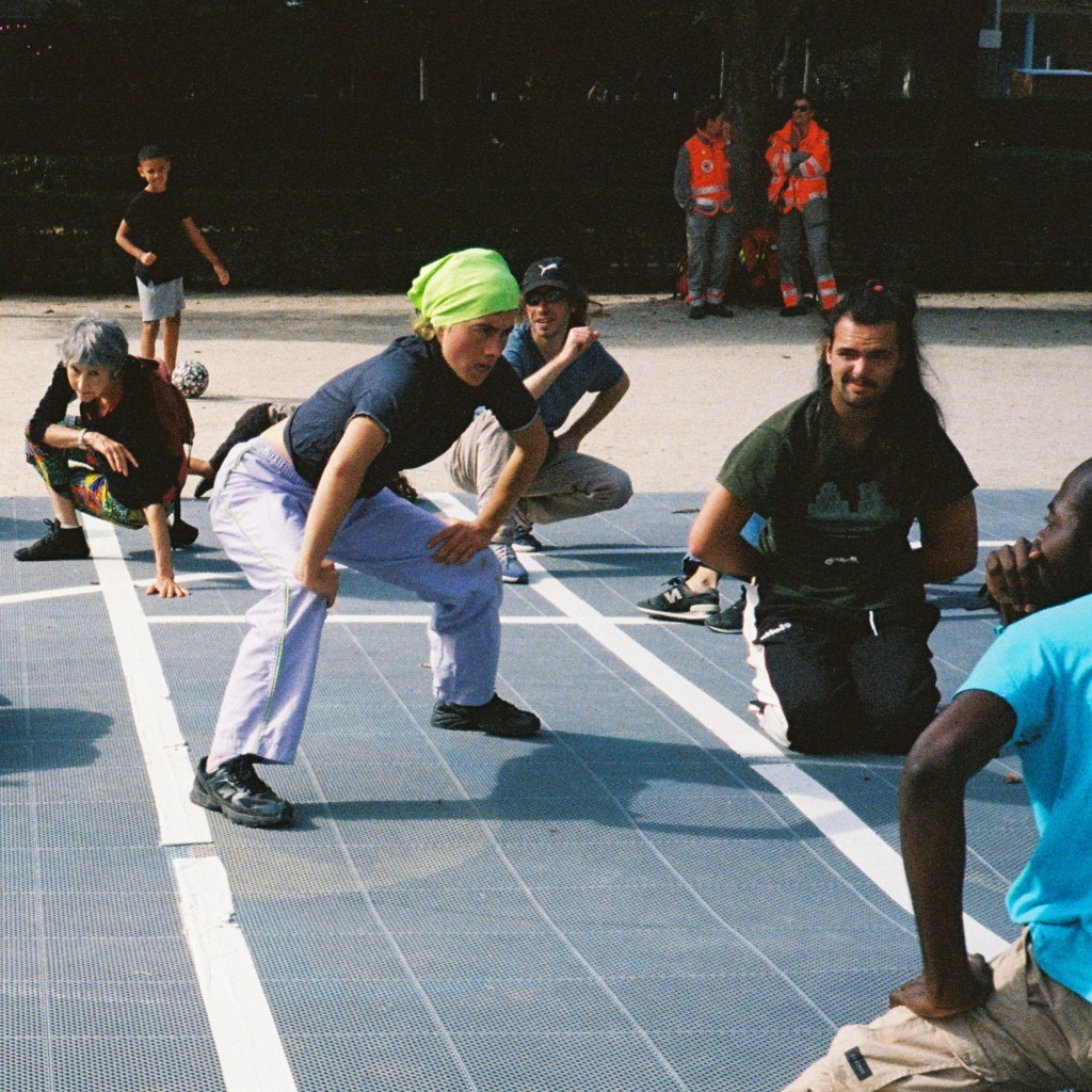 It’s a physical and participatory practice at the crossroads between a show, a workshop and an in-situ performance. Sport is a common ground, a starting point for taking participants to a place where they don’t expect to be: improvisation. In this way, the boundary between physical practice and sport creates unique and fertile choreographic and relational challenges, each time new. Warming up together – warming up the space and allowing improvisation to emerge, creating a new way of working together that goes beyond the concept of winning or surpassing oneself.
